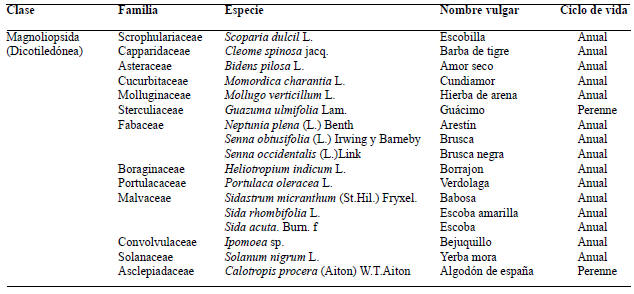 A este respecto, en la clase monocotiledoneae (Liliopsida) las familias presentes fueron: Poaceae y Cyperaceae. La clase dicotiledonea (Magnoliopsida) estuvo representadapor las familias: Euphorbiaceae, Amaranthaceae, Scrophulariaceae, Capparidaceae, Asteraceae, Cucurbitaceae, Molluginaceae, Sterculiaceae, Fabaceae, Boraginaceae, Portulacaceae, Convolvulaceae, Malvaceae, Solanaceae y Asclepiadaceae.