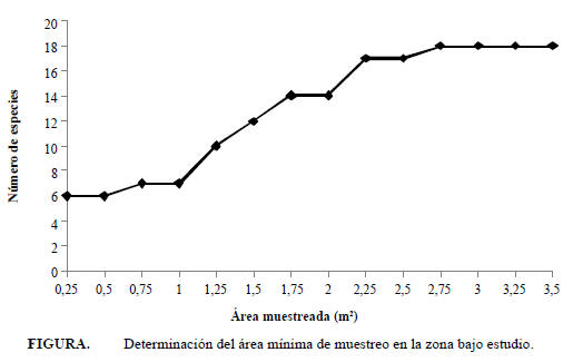 Se determinó el área mínima de muestreo (AMM); parámetro que indicó el tamaño más apropiado que se utilizó para realizar las mediciones correspondientes, basado en la metodología descrita por Fuentes (1986) que relaciona el número de especies aparecidas en la muestra con el aumento del área bajo muestreo.
