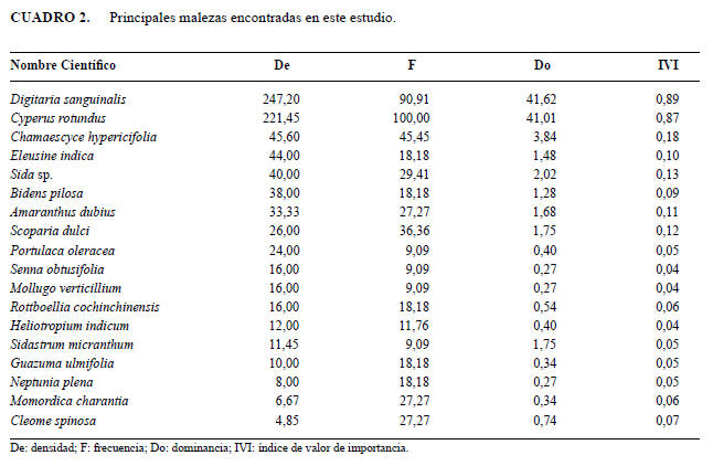 De acuerdo al IVI y de formageneral en el área bajo estudio las 10 especies asociadasal cultivo más importantes son: D. sanguinalis, C. rotundus, C. hypericifolia, Sida sp., S. dulcil, A. dubius, C. spinosa, E. indica, B. pilosa y M. charantia.