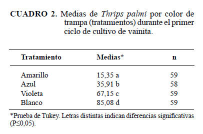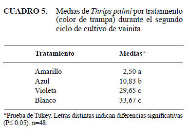 Las trampas de color blanco y violeta no presentaron diferencias significativas entre sí durante este ciclo, pero sí de los otros colores utilizados. Asimismo, las trampasde color azul resultaron significativamente diferentes de las amarillas (Cuadro 5).