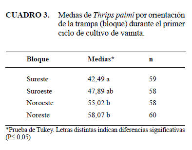 De acuerdo al análisis de varianza (Cuadro 1), se observaron diferencias significativas para el bloque (orientación de las trampas); colectándose el mayor número de insectos en la posición noreste (3.484) y el menor en la sureste (2.538). Al utilizar la prueba de Tukey, esta arrojó tres grupos estadísticamente diferentes entre sí: un grupo conformado por la posición donde se encuentrainvolucrado el norte, y los otros dos grupos correspondientes a las posiciones suroeste y sureste (Cuadro 3).