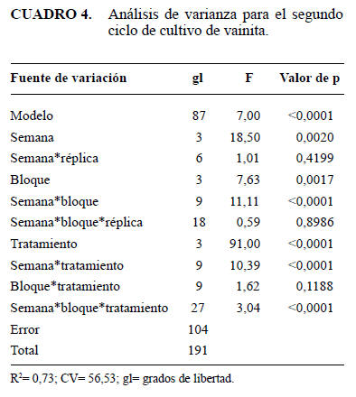 Segundo ciclo del cultivo: el análisis estadístico (Cuadro 4) arrojó diferencias altamente significativas para tratamiento (color de la trampa) y diferencias significativas para bloque (orientación de las trampas).