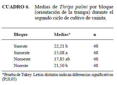 Al igual que en el primer ciclo de cultivo, hubo diferenciassignificativas con respecto a la orientación de las trampas,obteniéndose tres grupos estadísticamente diferentes; el grupo donde se encuentra involucrado el este no difiere entre sí, pero se contrasta de los restantes: suroestey noroeste (Cuadro 6).