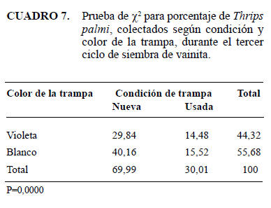Con respecto a la condición de la trampa, el mayor númerode ejemplares de T. palmi se obtuvo con las nuevas, posiblemente porque el sol degradó el color de las usadas, lo cual ocurre, según Quartino (2006) y CABOT (2012) por la migración de componentes o la oxidación producida por los factores climáticos, en particular por la radiación ultravioleta de la luz solar. Por su parte, Stevens et al. (1991) señalaron que los plásticos transparentes se degradan con frecuencia bajo la exposición de los rayos ultravioleta del sol. Asimismo, Childers y Brecht (1996) indicaron que la atracción de los trips puede variar debido a la degradación del color de las trampas por la luz del sol. En este período se presentaron diferencias altamente significativas entre los porcentajes de captura para el color y la condición de la trampa; observándose que la nueva de color blanco tiene el mayor porcentaje de captura ( Cuadro 7).