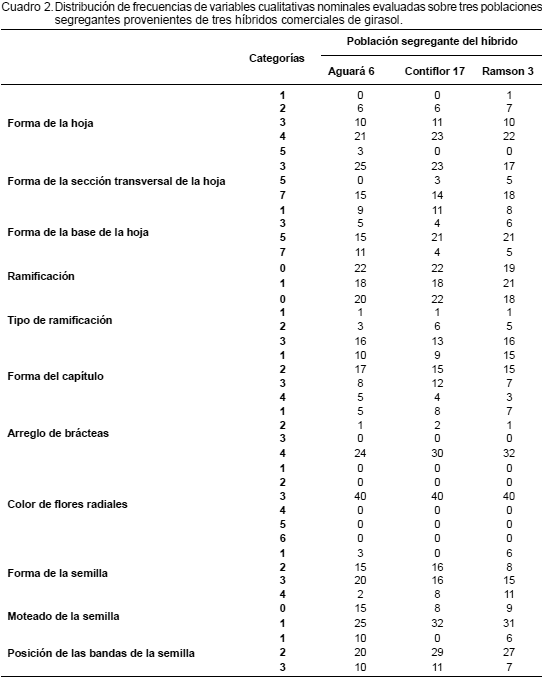 En las poblaciones segregantes, de todos los caracteres morfológicos evaluados, solo el color de flores radiales no presentó variación, siendo amarillo para las 120 plantas de cada población. En el Cuadro 2 se reporta la distribución de frecuencias de las 11 variables cualitativas nominales, observándose plantas con todas las categorías que definen los 10 caracteres morfológicos que identificó la variación, a excepción del arreglo de las brácteas del capítulo, en la cual no hubo plantas en la categoría de arreglo redondeado. Estos resultados permiten señalar que efectivamente se está expresando una amplia variación genética en las poblaciones segregantes.
