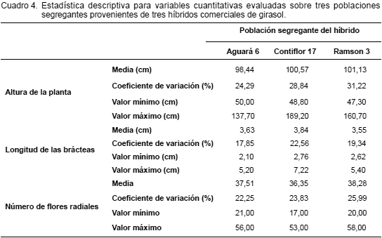 El Cuadro 4 señala la estadística descriptiva de las variables cuantitativas evaluadas. En promedio sobre las tres poblaciones segregantes, los coeficientes de variación para altura de la planta, longitud de brácteas y número de flores radiales fue de 28, 20 y 24%, respectivamente; estos caracteres poligénicos expresan una amplia variabilidad en las poblaciones mencionadas.