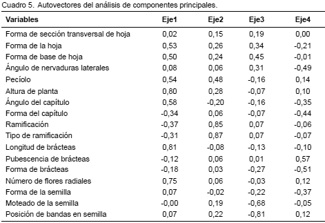 El Cuadro 5 permite visualizar que dentro y entre poblaciones segregantes, las variables que mejor explican la variación determinada fueron: altura de la planta, longitud de las brácteas y número de flores radiales, respecto al primer eje. En el segundo eje, la variación puede ser explicada mayormente por la ramificación y el tipo de ramificación. Estos resultados indican que la mayor variabilidad no solo se dio en algunas de las características que permitieron diferenciar a los híbridos (altura de planta y longitud de brácteas), sino que a éstas se sumaron otras variables.
