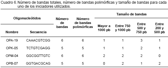 Se obtuvo un total de 22 bandas RAPD amplificadas mediante los iniciadores OPA-19, OPK-05, OPM-04, OPB-07 (sin bandas al utilizar el iniciador OPM-20). Los iniciadores OPM-04 y OPA-19 lograron la amplificación de 6 bandas, mientras que OPK-05 y OPB-07 de 5 bandas. Todas las bandas fueron polimórficas y estuvieron en un rango de tamaño entre 200 y 1250 pares de bases. No se observaron bandas únicas (Cuadro 6).