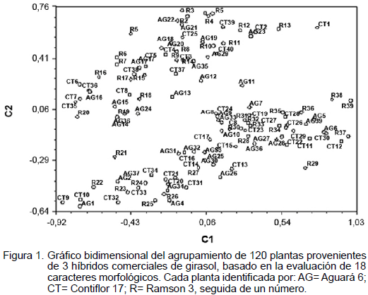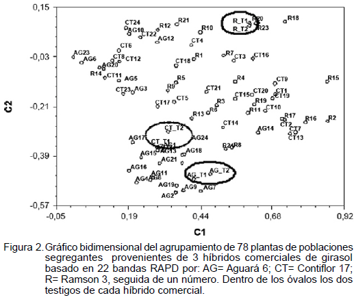 Por ejemplo, individuos de la población segregante proveniente de Aguará 6, se parecen más a individuos, tanto de Ramson 3 como de Contiflor 17, que a plantas de la misma población segregante proveniente de Aguará 6. Es decir, las poblaciones provenientes de los tres híbridos de girasol evaluados, no tienen una identidad genética particular que permita agruparlos y diferenciarlos de los otros híbridos.