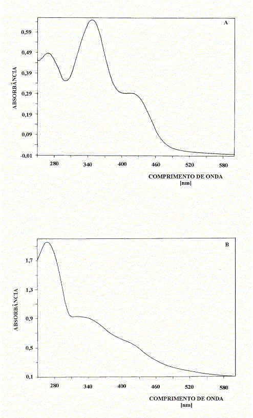 Esta perda pode ser visualizada nas Figuras 1 e 2 onde estão apresentados os espectros de absorção do complexo e - trinitrofenil (TNP)-lisina da farinha desengordurada (A) e dos três produtos de extrusão (B, Ce D) na faixa de 280- 580nm. Pode-se observar no espectro correspondente a farinha desengordurada (A), a presença do pico característico da lisina a 342 nm.