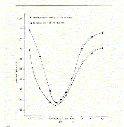 A solubilidade mínima em pH ao redor de 4,5, também rol observada por Santanna Filho et al. (23) e Taha (24), em isolados protéicos e farinha de feijao guandu. Porém, Oshodi & Ekperigin (25), observaram que a solubilidade mínima da proteína da farinha de feijão guandu ocorreu em pH 5,0. Perfil similar de solubilidade de proteínas em função do pH foram descritos para diferentes tipos de leguminosas, tais como adzuki bean (Vigna angularis L.) (30), tremoço (Lupinus mutabilis) (19), Mesquite bean (Prosopis juliflora) (31), cowpea (Vigna unguiculata (L.) Walp) (21,22), winged bean (Psophocarpus tetragonolobus (L.) DC) (17) e horse gram (Macroty!oma uniflorum (Lam.) Verdc.){32).