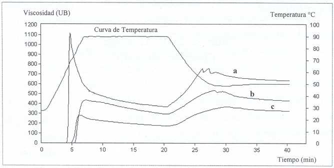 Los parámetros a considerar fueron los siguientes: temperatura de gelatinización, viscosidad inicial, viscosidad máxima (pico de viscosidad), viscosidad al final del período de calentamiento (90 °C, 15 min), viscosidad a 50 °C. Estos parámetros expresados en unidades Brabender (UB) fueron determinados según el software del equipo (viscograph 2.0.12). Para efecto de cálculos se denominó a la viscosidad máxima como P, viscosidad al final del período de calentamiento a 90 °C como H y la viscosidad a 50 °C como C. Las características reológicas como estabilidad, asentamiento y consistencia expresadas en unidades Brabender se interpretaron y calcularon de acuerdo a Mazur et al. (13) y Merca y Juliano (14). Entendiéndose como: Estabilidad la diferencia entre la viscosidad máxima y la viscosidad al final del período de calentamiento (90 °C); Asentamiento: la diferencia entre la viscosidad a 50 °C y la viscosidad máxima; Consistencia: la diferencia entre la viscosidad a 50 °C y la viscosidad al final del período de calentamiento (90 °C).