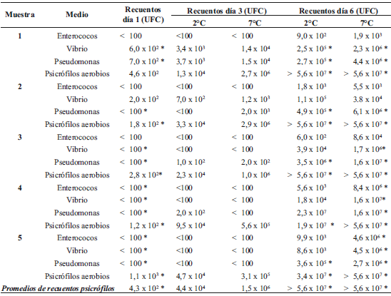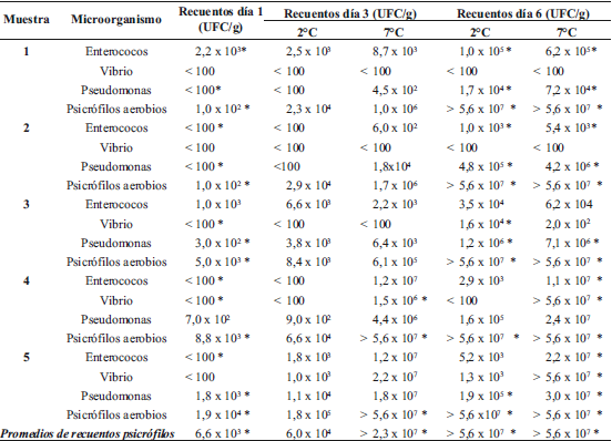 Las Tablas 1 y 2 muestran los resultados para la evaluacion microbiologica de las poblaciones bacterianas presentes en la picuda, en estacion seca y lluviosa durante su almacenamiento en refrigeración por 6 días. El 70% de las muestras almacenadas a 7ºC presentó un recuento total psicrófilo superior a 106 a partir del día 3 de almacenaje, y el 100 % de las muestras mantenidas a 2 y 7ºC superaron este valor luego del sexto día de almacenaje. No existe diferencia estadística entre los recuentos psicrófilos obtenidos al comparar la estación seca y la lluviosa (p<0,05)
