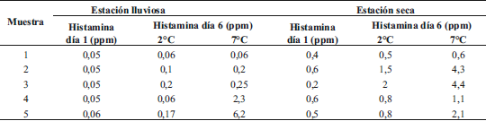 Resultados del ensayo inmunoenzimático para la determinación cuantitativa de histamina producida en muestras recolectadas durante las estación lluviosa y seca del año durante su almacenamiento.