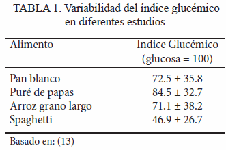 La variabilidad del IG publicado para alimentos simples se explica por las diferencias en la estructura física de las partes involucradas, y el proceso de elaboración tanto industrial como culinario. A esto deben agregarse diferencias en la metodología usada por los diversos autores. Por este motivo se adhirió en este trabajo a la metodología recomendada por la OMS. Si bien el IG de un alimento compuesto suele coincidir con el promedio ponderado del IG de sus componentes, facilitando su cálculo, las recetas posibles son tantas que requieren criterios prácticos a la hora de formular recomendaciones de utilidad para la comunidad, y para ello deben conocerse con certeza los IG de los principales componentes que son fuente de carbohidratos en el plato considerado.
