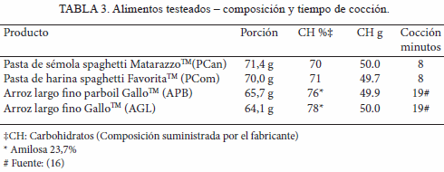 La primera sesión se dedicó a la pasta de trigo candeal, la segunda al arroz parboil, la tercera a la glucosa (un vaso con 250 ml de agua y 50 ±0,2 g de glucosa anhidra farmacopea conformando una solución de glucosa al 20%), la cuarta para la pasta de trigo común y la quinta para arroz grano largo fino. En todos los casos el arroz comercial pulido y las pastas secas fueron prefraccionados para porciones con 50±0,3 gramos de carbohidratos asimilables, y se colocó cada porción en bolsas hervidoras microperforadas individuales que fueron termoselladas. Los tiempos de cocción en agua a temperatura de ebullición fueron los recomendados por el fabricante para las condiciones de consumo habitual, que son 8 minutos para la pasta y 19 minutos en el caso del arroz. En este último caso se verificó mediante el método propuesto por Juliano B.O. (16) observando que más del 90% de los granos colocados entre dos placas de vidrio no presenten centro opaco. Se resumen junto con los contenidos de carbohidratos en la Tabla 3.