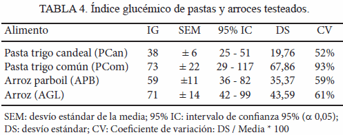 No fue posible encontrar estudios publicados sobre medición del IG de pastas de harina de trigo común, aunque algunos valores de las publicaciones podrían corresponder a esta variedad. Esto destaca la oportunidad de la presente medición para ampliar la información disponible. El valor hallado en este ensayo para la pasta de trigo candeal (38 ±6) coincide con las publicaciones existentes, pero el IG de la pasta de trigo común (73 ±22) es significativamente mayor y con notable amplitud individual. Para el arroz blanco el IG (71 ±14) también coincide con la media de los estudios publicados cuyos índices varían en un rango muy amplio, mientras que hay pocos datos sobre el arroz parboil aunque el hallado (59 ±11) es levemente superior a los publicados en otros países.