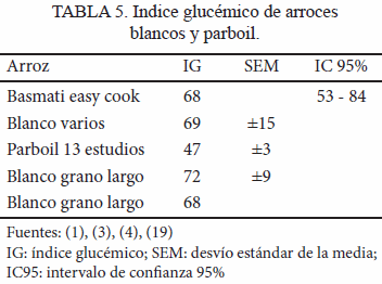 Extrayendo selectivamente los valores publicados para el arroz grano largo fino, tanto en su presentación sencilla (pulido no parboil) como en su versión parboil se observa un IG entre 68 a 72 para el arroz blanco y un IG de 47 para el arroz parboil (Tabla 5).
