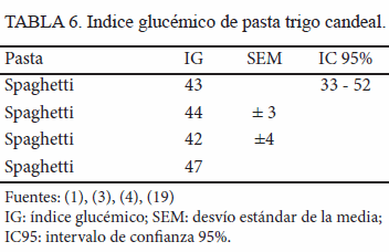 Las mismas fuentes citan para pastas comparables elaboradas con sémola de trigo candeal cocidos entre 8 a 12 minutos valores de IG entre 42 y 47 (Tabla 6)