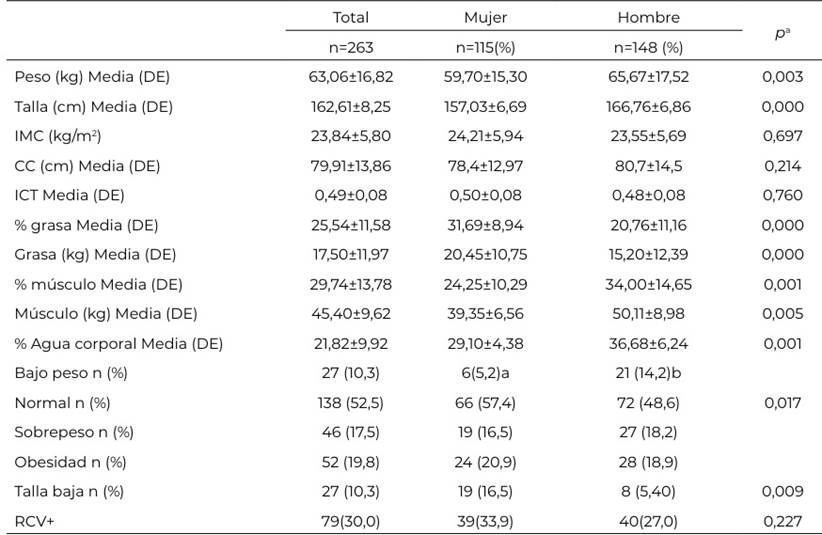 a t de student; IMC: índice de masa corporal; CC: circunferencia de cintura: ICT: índice cintura-talla; RCV+: riesgo cardiovascular elevado, subíndices diferentes indican diferencias significativas