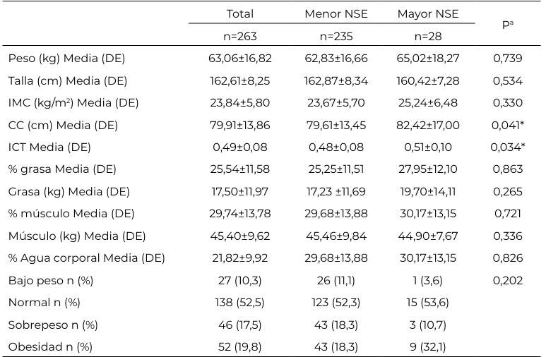 En el NSE alto se observó 32,1% tenían obesidad, mientras que 18% en los de NSE bajo, sin diferencias significativas (p=0,202). Sin embargo, si se observa significancia para la CC (p=0,041) y en el ICT (p=0,034) en el grupo de mayor NSE (Tabla 3).