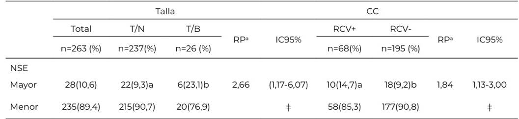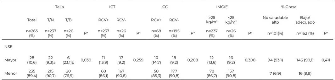 Chi-cuadrada: NSE: nivel socioeconómico: Mayor incluye NSE alto: Menor incluye un NSE bajo-medio: IMC/E: índice de masa corporal para la edad; T/E: talla para la edad; ICT: índice cintura-talla; RCV: riesgo cardiovascular; CC: circunferencia de cintura; T/N: talla normal; T/B: talla baja. Subíndices diferentes indican diferencias significativas.