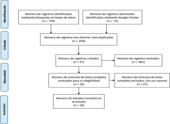 Se realizó una búsqueda en las bases de datos Pubmed, SciELO, BVS - Medline, Wiley Online Library y Dialnet mediante las palabras clave “dieta antiinflamatoria/anti inflammatory diet”, “salud mental/mental health”, “ansiedad/ anxiety” y “depresión/depression”. Se realizó una lectura del título del artículo de manera inicial para determinar cuáles eran aquellos que trataban el tema de interés. Entre los seleccionados, a posteriori, se realizó un cribado más preciso leyendo el resumen del artículo y observando si los artículos seleccionados cumplían los criterios de inclusión. Además, se realizó una última búsqueda en Google Scholar con distintas cadenas de búsqueda para incluir aquellos artículos de interés que no se hubieran encontrado en las búsquedas previas a partir de las bases de datos. Finalmente, los artículos considerados válidos para esta revisión narrativa y que cumplían los criterios de inclusión fueron un total de 10 (Figura 1).
