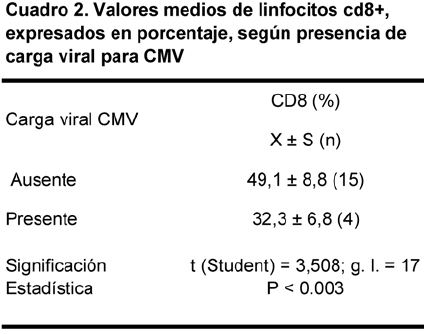 Es importante señalar, que los pacientes con presencia de CMV en sangre periférica, presentaron cifras porcentuales de linfocitos CD8+ significativamente menores, que los niños sin viremia para dicho patógeno. Hasta qué punto la disminución de esta subpoblación influye en la presencia de infección por este virus, es difícil de precisar, sin embargo, la función ejercida por este grupo de células en la defensa antiviral en general, lleva a pensar en el efecto protector de las mismas en la progresión de las infecciones por ambos virus, por lo que se podría inferir que el porcentaje significativamente menor de dichas células, podría ser uno de los factores propiciantes de esta situación (13)
