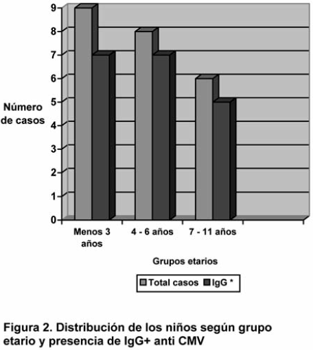 Se evaluaron 23 niños de ambos sexos, 9 menores de 3 años (39,1%), 8 entre 4 y 6 años (34,8%) y 6 entre 7 y 11 años (26,1%). De ellos 17 (73,9%) tenían evidencia de infección pasada por CMV (IgG+ IgM-) y dos, 8,7% infección aguda (IgM e IgG +) (Figura 1). El promedio de edad de los niños con infección aguda fue de dos años, mientras que en los niños que tenían únicamente IgG + fue de 4,6 ±2,6 años de edad. El 77,7% (7 de 9), 87,5% (7 de 8)y 83,3% (6 de 5) respectivamente de los niños menores de tres años, de 4 a 6 años y de 7 a 11 años tuvieron IgG+ para el virus (Figura 2). En los niños con infección aguda (IgM anti CMV+) el promedio de carga viral inicial fue de 11920 VID. Dos pacientes IgM - IgG+ mostraron un promedio de carga viral de 23429 VID; en el resto, fue indetectable (Cuadro 1). La sensibilidad de la IgM especifica como prueba diagnóstica, en relación con la presencia de carga viral detectable para CMV, fue de 50%, con una especificidad del 100%, por cuanto todos los pacientes sin carga viral fueron IgM anti CMV negativos. El 50% de los niños sin evidencia serológica de infección aguda, tenían algún grado de compromiso del sistema inmune (CD4+ por debajo del 25%), mientras que el porcentaje de CD4+ fue normal en tres de los cuatro niños con carga viral detectable. En relación con los linfocitos CD8+ en los pacientes con carga viral para CMV, su promedio fue mucho menor que en aquellos sin infección por el mencionado virus: 32,3 vs 49,1% (p<0,003) (Cuadro 2)