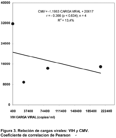 Desde el punto de vista clínico, todos presentaron una evolución favorable, y ninguno deterioro virológico (VIH) franco, ya que un año más tarde, dos eran indetectables, y los otros dos experimentaron una disminución de la carga viral, signifitiva sólo para uno de ellos (Cuadro 3). Inicialmente, no existió correlación significativa entre la carga viral del VIH y los valores de carga de CMV, ya que el coeficiente de correlación de Pearson fue de 0.336 (p >0.05) (Figura 3).