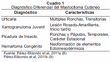 El mastocitoma solitario es la segunda variante clínicomorfológica más frecuente de las mastocitosis de la niñez, sólo después de la urticaria pigmentosa. Ocurre un infiltrado masivo aberrante de mastocitos en la piel sin involucro orgánico interno. Puede ser congénito o aparecer de manera precoz durante los primeros dos años de vida como una tumoración cutánea aislada, o excepcionalmente tres a cinco neoformaciones separadas y dispersas en un mismo individuo. La liberación espontánea o provocada de histamina, heparina, hidrolasas ácidas, leucotrienos, prostaglandinas, y factor activador de plaquetas, entre otros mediadores proinflamatorios, se responsabiliza del prurito, el desarrollo de formaciones habonosas y vesicoampulares intralesionales, y enrojecimiento difuso transitorios. En casos graves, acontece hipotensión arterial, datos de insuficiencia respiratoria, y sintomatología digestiva. No se conoce el mecanismo fisiopatológico que explique la proliferación y acúmulo focalizado de mastocitos en la piel; se ha propuesto un proceso reactivo inespecífico iniciado por la participación de diversos factores de crecimiento e IL-3 en sujetos susceptibles. Se debe distinguir de otras patologías con lesiones morfológicas similares tal como se muestra en el Cuadro 1 (8,9).