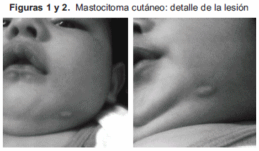 Se presenta el caso de un lactante menor con tumoración cutánea benigna localizada en el aspecto submandibular izquierdo de la cabeza compatible con mastocitoma cutáneo solitario. Esta rara lesión tumoral es parte del grupo heterogéneo de las mastocitosis, conjunto de enfermedades que resulta de la infiltración anómala de mastocitos en diferentes tejidos corporales, afectando particularmente la piel. La variedad más común de mastocitosis en niños es la urticaria pigmentosa, seguida del mastocitoma cutáneo que contabiliza entre el 10 y 15% de todos los casos. Suele situarse en tronco o extremidades, aunque como en este paciente puede localizarse en cabeza u otros sitios corporales. Es de aparición precoz durante la primera infancia o alguna vez congénito; por lo regular no hay participación de órganos internos o situaciones potencialmente letales. Su curso es crónico con remisiones parciales y exacerbaciones sintomáticas molestas como fenómenos de urticación y desarrollo de ampollas frente a estímulos externos o internos que preocupan a los familiares cercanos. Su reconocimiento clínico precoz y la pronta instauración terapéutica con esteroides locales, antihistamínicos orales u otras medidas pertinentes, aceleran el tiempo de resolución casi siempre espontánea hacia los 2 años de vida; es importante la debida explicación a los padres.