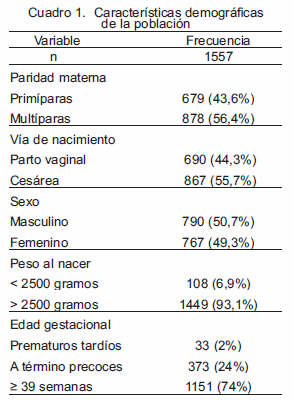Las características generales de esta población están mostradas en el cuadro 1. El 43,6% de las parturientas estuvo conformado por primíparas. Hubo más niños nacidos por sección cesárea que por parto vaginal (55,7% vs 44,3%, respectivamente). 108 (6,9%) neonatos pesaron menos de 2500 gramos. 33 niños fueron prematuros tardíos (2,1%) y 373 (24%) fueron recién nacidos a término precoces.