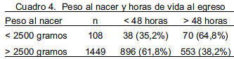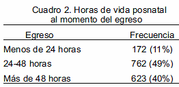 En relación a la edad posnatal del egreso, el 60% (934/1557) de los neonatos fue egresado antes de 48 horas, e incluso de este grupo de 934 niños, 172 fueron dados de alta antes de cumplir 24 horas de vida (Cuadro 2).