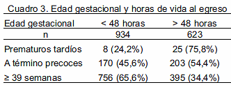 Al analizar la asociación entre la edad gestacional y el momento del alta hospitalaria, hubo una relación inversa entre edad gestacional y precocidad del egreso. Así, a medida que la edad gestacional aumentó, la incidencia del egreso precoz también fue mayor: 24,2%, 45,6% y 65,6% para prematuros tardíos, neonatos a término precoces y neonatos mayores de 39 semanas, respectivamente. A pesar de ello, 188 (46,3%) de los 406 niños menores de 39 semanas fueron egresados antes de 48 horas. (Cuadro 3).