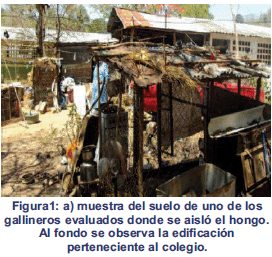 Durante la visita al aérea se tomaron muestras de los suelos de los gallineros así como de la zona del árbol donde se estimó que fue la fuente de contagio común (figura 1), el estudio de estas muestras (10 en total) se realizó en el Laboratorio de Micología Médica Dr. Dante Borelli del Instituto de Medicina Tropical, Facultad de Medicina de la Universidad Central de Venezuela, Caracas. El procesamiento se efectuó según el método de Larsh (25).