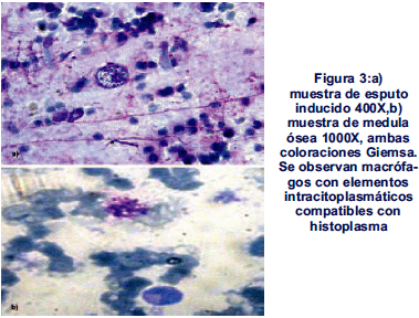 En cuanto al análisis serológico de estos pacientes se resalta el hecho de que al ingreso fue negativo para todos (el tiempo trascurrido entre la enfermedad y la toma de muestra en todos los casos fue estimado por encima de la quinta a la sexta semana de haberse iniciado los signos clínicos de la enfermedad). La serología se mantuvo negativa en la muestra control (luego de 3 meses de seguimiento) para los seis pacientes restantes, tomando en cuenta que el caso índice falleció previo a este período de tiempo. El estudio de esputo del caso índice demostró la presencia de levaduras intracelulares compatibles con Histoplasma capsulatum. Iguales resultados se obtuvieron de los 7 aspirados de médula ósea (Figura 3).