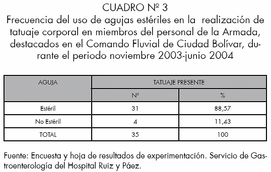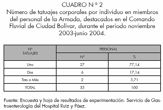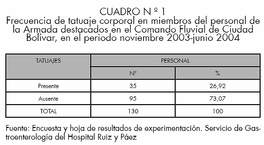 130 miembros de la Armada, destacados en el Comando Fluvial de Ciudad Bolívar, fueron estudiados para la detección de tatuaje corporal y ninguno resultó reactivo para anticuerpo anti-VHC. El 26,92% (35) lo presentaron (cuadro no 1). El número de tatuaje corporal por individuo encontrado con mayor frecuencia fue de uno, con un 77,14 % (27) casos (cuadro no 2). El uso de agujas estériles en la realización del tatuaje corporal, tuvo una frecuencia de 88,57% (31) casos (cuadro no 3). Del personal con tatuaje corporal (35) que representaron el 26,92%, ninguno resultó reactivo al anticuerpo anti-VHC (cuadro n° 4).