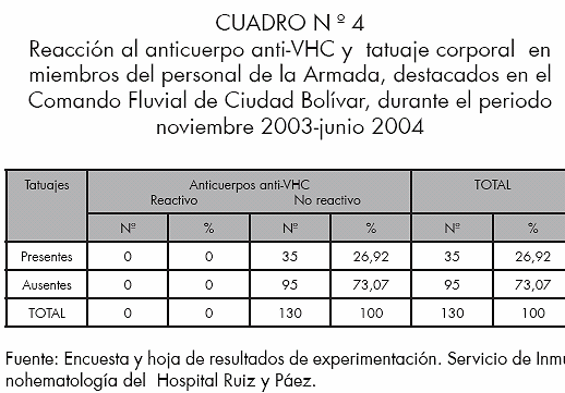 Frecuencia de anticuerpos anti-Vhc y tatuaje corporal en miembros del personal de la Armada. Comando fluvial de Ciudad Bolívar. Noviembre 2003 Junio 2004.