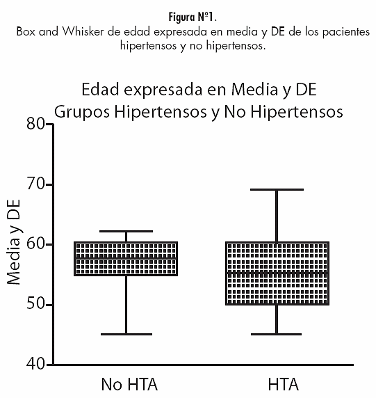 En el grupo de los pacientes hipertensos hubo un total de 27 pacientes con patrón vascular alterado, siendo todos exclusivamente por aumento del mismo, representando un 65.9% del total de ese grupo. En los pacientes no hipertensos se observó un patrón vascular anormal en solo 04 pacientes (20%), distribuidos en 03 pacientes con patrón vascular aumentado (15%) y 01 paciente con patrón vascular disminuido (5%).