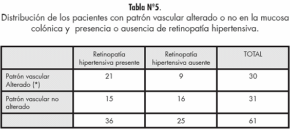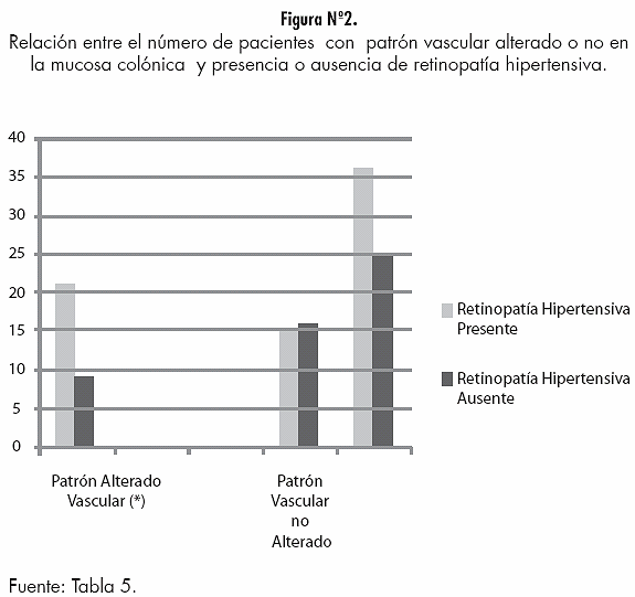2. El patrón vascular alterado en la mucosa colónica de los pacientes estudiados resultó no tener valor diagnóstico para retinopatía hipertensiva.