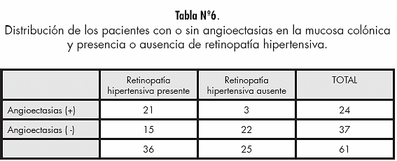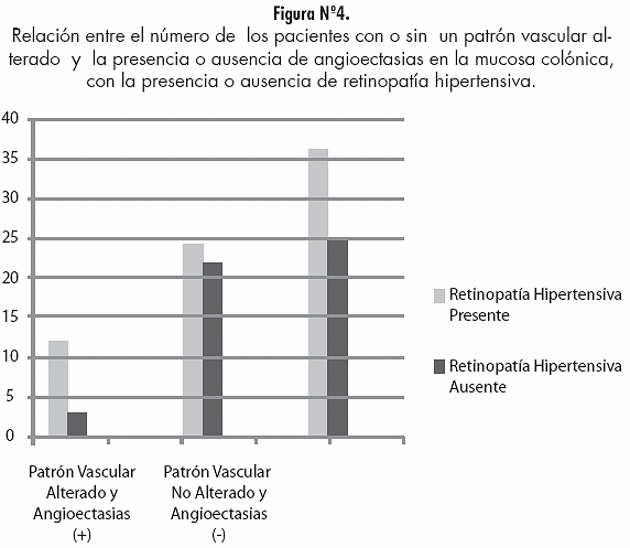 4. El patrón vascular alterado asociado a la presencia de angioectasias en la mucosa colónica de los pacientes estudiados resultó no tener valor diagnóstico para retinopatía hipertensiva.