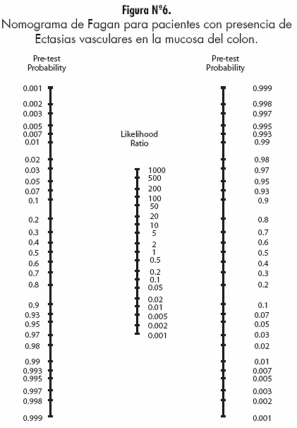 En este ejemplo, si usted le asigna a un paciente igual probabilidad de tener o no, retinopatía hipertensiva (pre-test del 50%), la presencia de angioectasia en la mucosa colónica con un likelihood ratio de 4.86 elevará esta probabilidad al 80% (probabilidad post-test) (Ver figura 6).