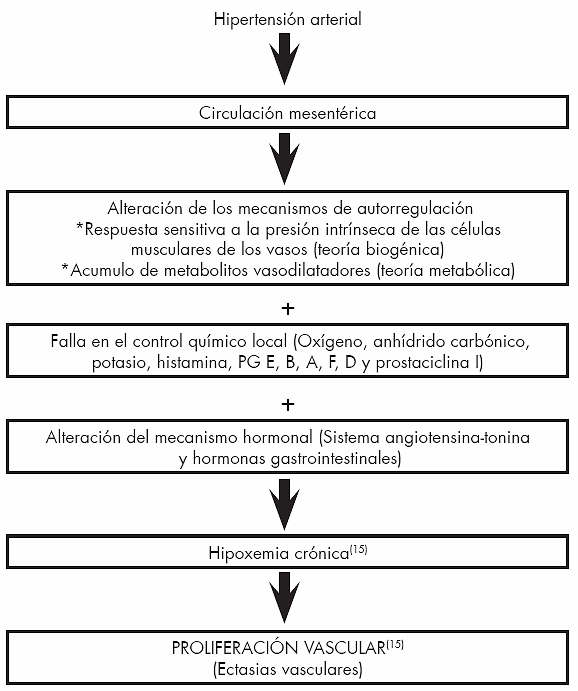 De los 36 pacientes con retinopatía hipertensiva, 21 pacientes (58%) presentaron angioectasias, siendo en su mayoría en poca cantidad y localizadas. Kozarek y col. en su estudio sobre colopatía portal encontraron un 70% de pacientes con ectasias vasculares múltiples(37). Es razonable pensar que en un paciente con hipertensión arterial de larga evolución, los mecanismos de regulación de la circulación mesentérica no sean del todo efectivos pudiendo suceder que: