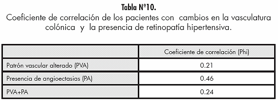 El coeficiente de correlación (Phi) fue de 0.46. Al haber la existencia de una correlación positiva en los pacientes con presencia de angioectasias en la mucosa del colon y retinopatía hipertensiva, se plantea que la evidencia de angioectasias en la mucosa colónica podría ser utilizado como factor predictor de retinopatía en pacientes hipertensos.