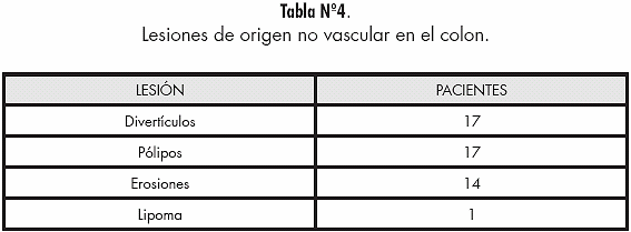 Dentro de las lesiones de la mucosa colónica de origen no vascular, 49 pacientes del total del grupo estudiado las presentaron, siendo distribuidas en la siguiente tabla: