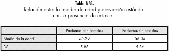 Se calculó p, para determinar si existe o no significancia entre la edad y el tener o no ectasias, resultando una (p = 0.6045), siendo no significativa estadísticamente.