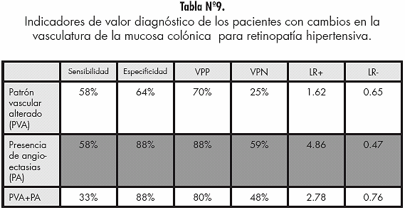 En este estudio se le dio importancia a 2 características de la mucosa colónica de los pacientes con retinopatía hipertensiva; la presencia de un patrón vascular alterado (aumentado o disminuido), y la presencia de angioectasias. Ambas variables fueron evaluadas de forma independiente y en conjunto dentro de la unidad muestral, determinándose que solo la existencia de angioectasias aporta un valor predictivo positivo en el diagnóstico de retinopatía hipertensiva, con una especificidad de 58%, sensibilidad de 88% y un likelihood ratio positivo de 4.86, y una probabilidad post-test de 80%.