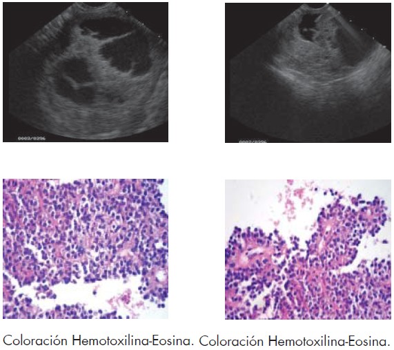 La prevalencia de las lesiones quísticas aumenta con la edad del paciente. Tal como lo describe Brugge W.(3), la incidencia de los cistoadenomas mucinosos son del 2-5% de todos los tumores exocrinos pancreáticos, afecta comúnmente a la mujer en un rango de 9:1 y en una edad mayor a la 5ta década, la literatura describe su apariencia morfológica como macroquistesseparados por septos, con calcificaciones periféricas en un 15% de los casos, y puede haber proyecciones papilares(4); histológicamente son lesionesformadas por células epiteliales productoras de mucina con una diferenciacióngastroenteropancreática y epitelio columnar; de acuerdo al grado de displasia se clasifican (benigno, borderline y adenocarcinoma), en relación con el grado de displasia las células pueden mostrar variabilidad en eltamaño y contorno, núcleos vesiculosos y nucleolos evidentes; el citoplasma es eosinofílico y se les considera la contra parte pancreática de lesiones mucinosas de ovario en cuanto al comportamiento biológico y diferenciación celular (foto 1). De los dos pacientes presentados en este trabajo confirmadoscon la histología, uno tenía los hallazgos más frecuentes descritos enla literatura y el otro sería una variante poco común, ya que la apariencia ecoendoscópica sugería un cistoadenoma seroso.