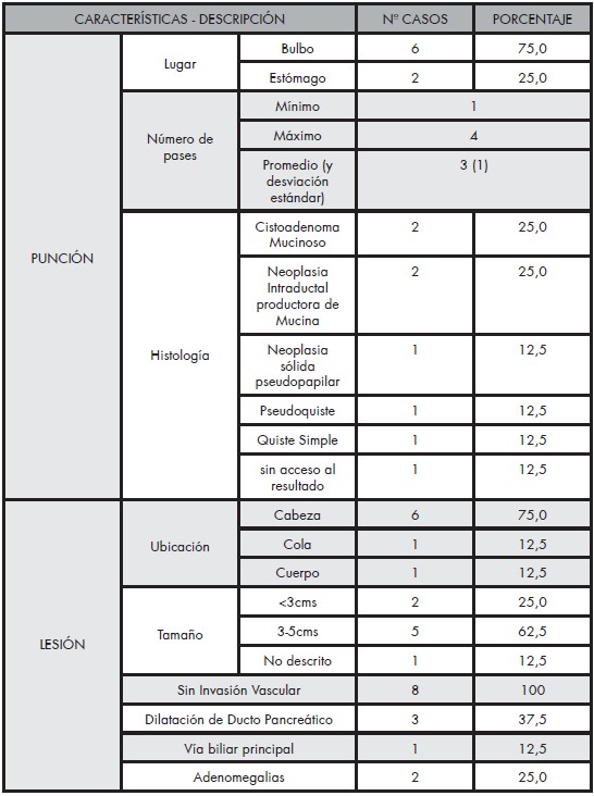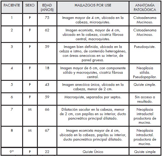 En dos pacientes femeninas mayores de 65 años la histología reportó cistoadenoma mucinoso benigno, ambos ubicados en la cabeza del páncreas; en uno de ellos los hallazgos ecoendoscópicos era microquistes que simulaban un panal de abejas, y la otra se describió como una imagen ecomixta de pared gruesa, cicatriz fibrosa central y macroquistes. En otra paciente que había presentado varios episodios de pancreatitis aguda y se complicó con un pseudoquiste pancreático, persistiendo la imagen por más de 2 años se decidió realizar la punción que confirmó un pseudoquiste, los hallazgos por USE era lesión única hipoecóica de pared gruesa, contenido heterogéneo con áreas anecóicas mal definidas en su interior. Se reportó una paciente femenina de 18 años con clínica de dolor abdominal y aumento de volumen, el USE evidenció en la cola del páncreas una lesión mayor de 6 cm con macroquistes separados por septos, con componente sólido y cicatriz fibrosa central, la histología confirmo una neoplasia sólida pseudopapilar. En una paciente se drenó en su totalidad una lesión única, menor de 2 cm, siendo el líquido claro, se sospechó de un quiste simple; las muestras de laboratorio y anatomía patológica se procesaron fuera de la institución, se tuvo acceso al resultado de la histología que dio negativo para malignidad. Otra paciente en quien se sospechó de un cistoadenoma mucinoso por las características ecoendoscópicas (macroquistes separados por septos), el líquido obtenido era blanquecino no espeso; la muestra igualmente no se procesó en el instituto.
